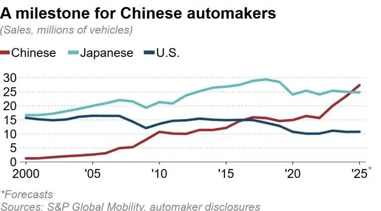 根据标普全球的最新预测,2025年中国汽车制造商的全球销量有望同比增长17%至2,700万辆,首次超越日本车企跃居全球榜首,终结其长达20余年的销量霸主地位。相比之下,日本车企全年销量预计持平,维持在2,500万辆以下。