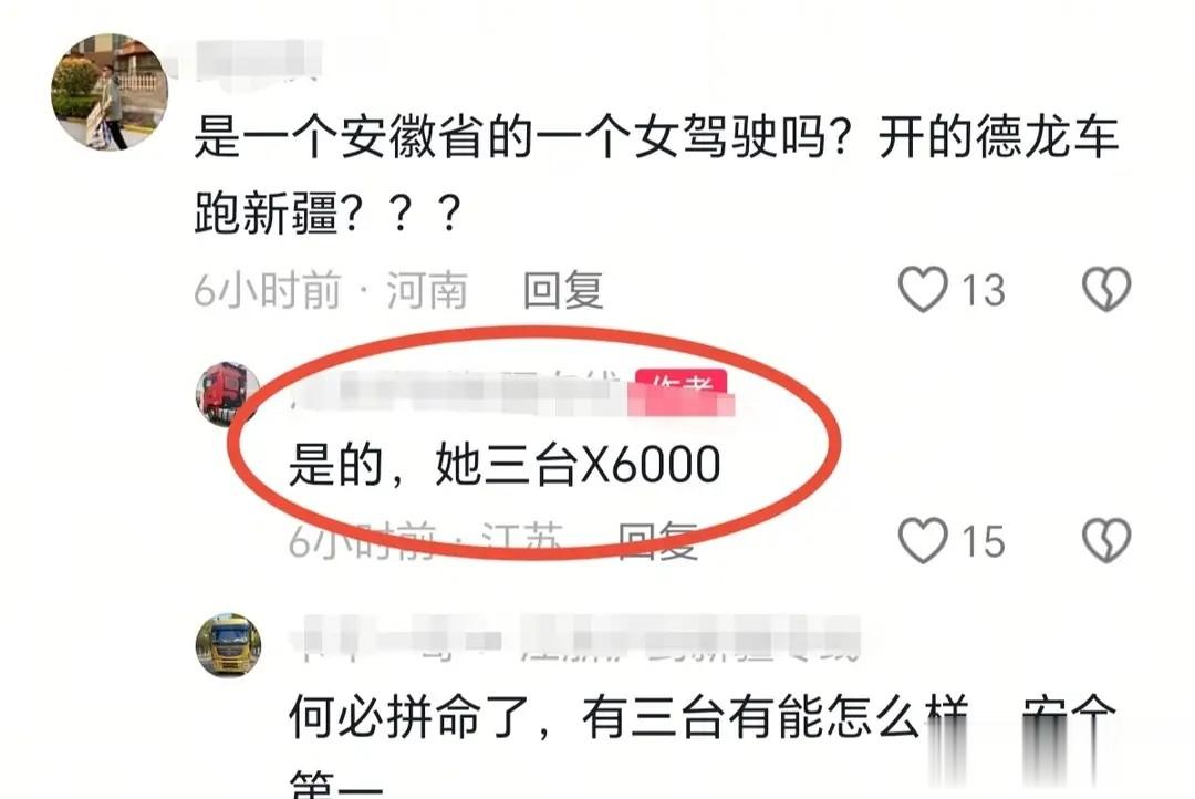 有网友在评论区询问:“是一个安徽的女驾驶吗?开德龙车跑新疆?”