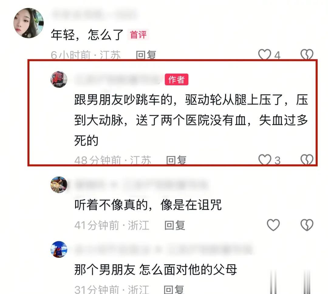 有一位网友表示,她跟男朋友发生争吵,情急之下就跳车了,结果驱动轮从腿上压了过去,但不幸的是,因压到了大动脉,辗转两个医院都没有血,最终因失血过多离世。