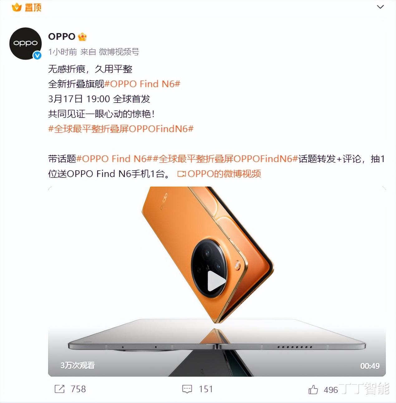 3月9日,OPPO官方正式对外官宣全新折叠旗舰机型OPPO Find N6,该机将于3月17日19:00举行全球首发发布会。此次新品以“无感折痕,久用平整”为核心卖点,主打“全球最平整折叠屏”。