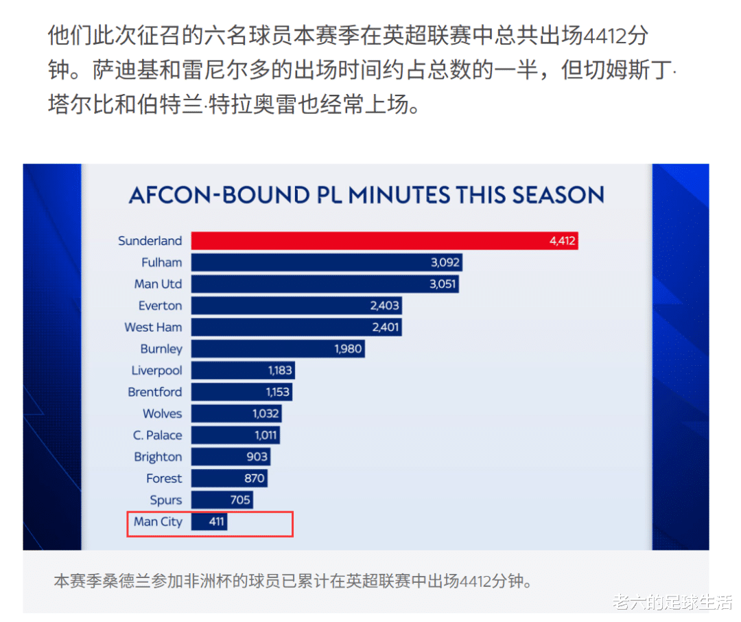 由于非洲杯的来临,英超有14家俱乐部都有球员离队参加非洲杯,在这些俱乐部里面,曼城因非洲杯的影响可谓是最小的,马尔穆什和努里总共只在英超出场了411分钟。