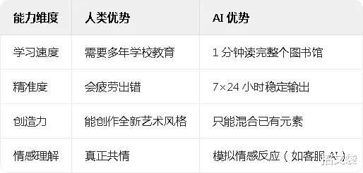 在学习速度方面,人类从小学开始,经过中学、大学等多年的学习,才能掌握丰富的知识和技能。而 AI 凭借强大的计算能力,在短时间内就能处理海量的数据,比如在 1 分钟内 “读完” 整个图书馆的书籍内容,快速获取大量信息。