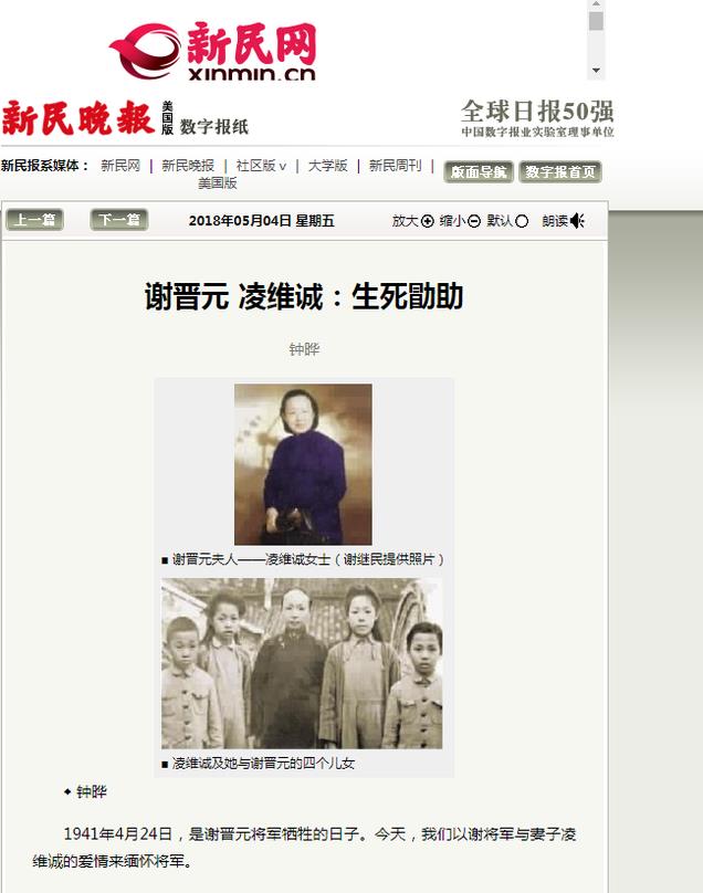 新民网 2018年5月4日 关于《谢晋元 凌维诚:生死勖助》的报道