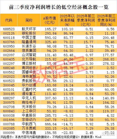 据证券时报·数据宝统计,今年前三季度净利润同比增长(含扭亏为盈)的低空经济概念股有25只。这些概念股今年以来平均上涨31.17%,大幅跑赢同期上证指数。航天环宇、银轮股份、中国卫星、隆鑫通用、长源东谷等累计涨幅超70%。