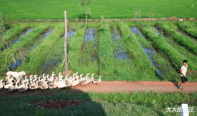 一名小男孩拿着塑料瓶走在前面,后面跟着鸭群和一只羊。