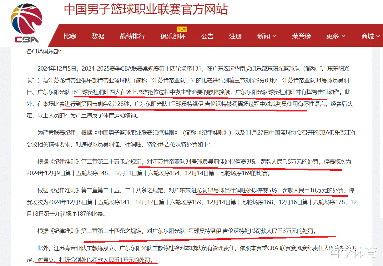 根据CBA的《纪律准则》,对广东队球员杜润旺进行了停赛5场、罚款人民币10万元的处罚。对江苏队球员吴羽佳进行了停赛3场、罚款人民币5万元的处罚!显然,杜润旺和吴羽佳都是对自己的行为,付出了惨重的代价。