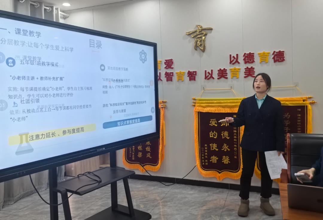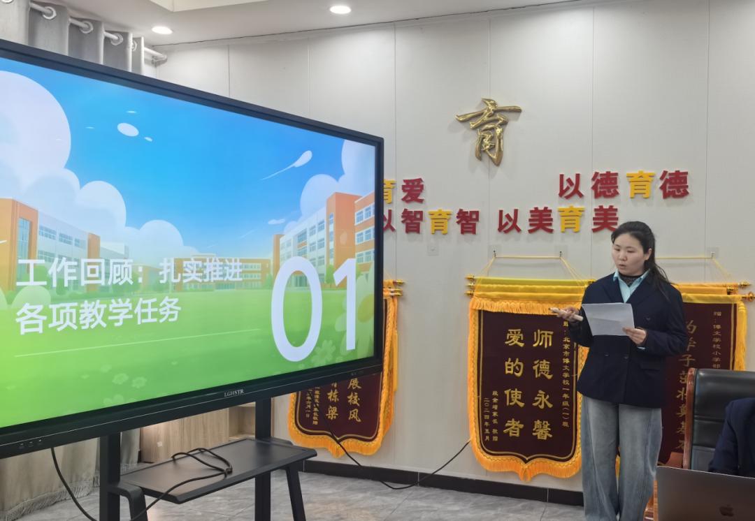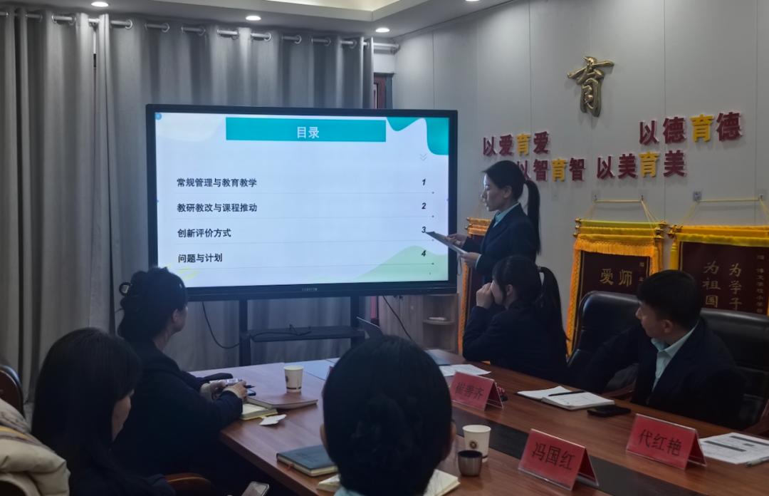 教学主任代红艳代表教导处述职。本学期教导处严抓教学常规与作业优化,推行多元评价机制,带领教师开展16次主题教研,搭建“英语角”等成长平台,未来将重点完善校本课程体系,强化学困生精准帮扶。