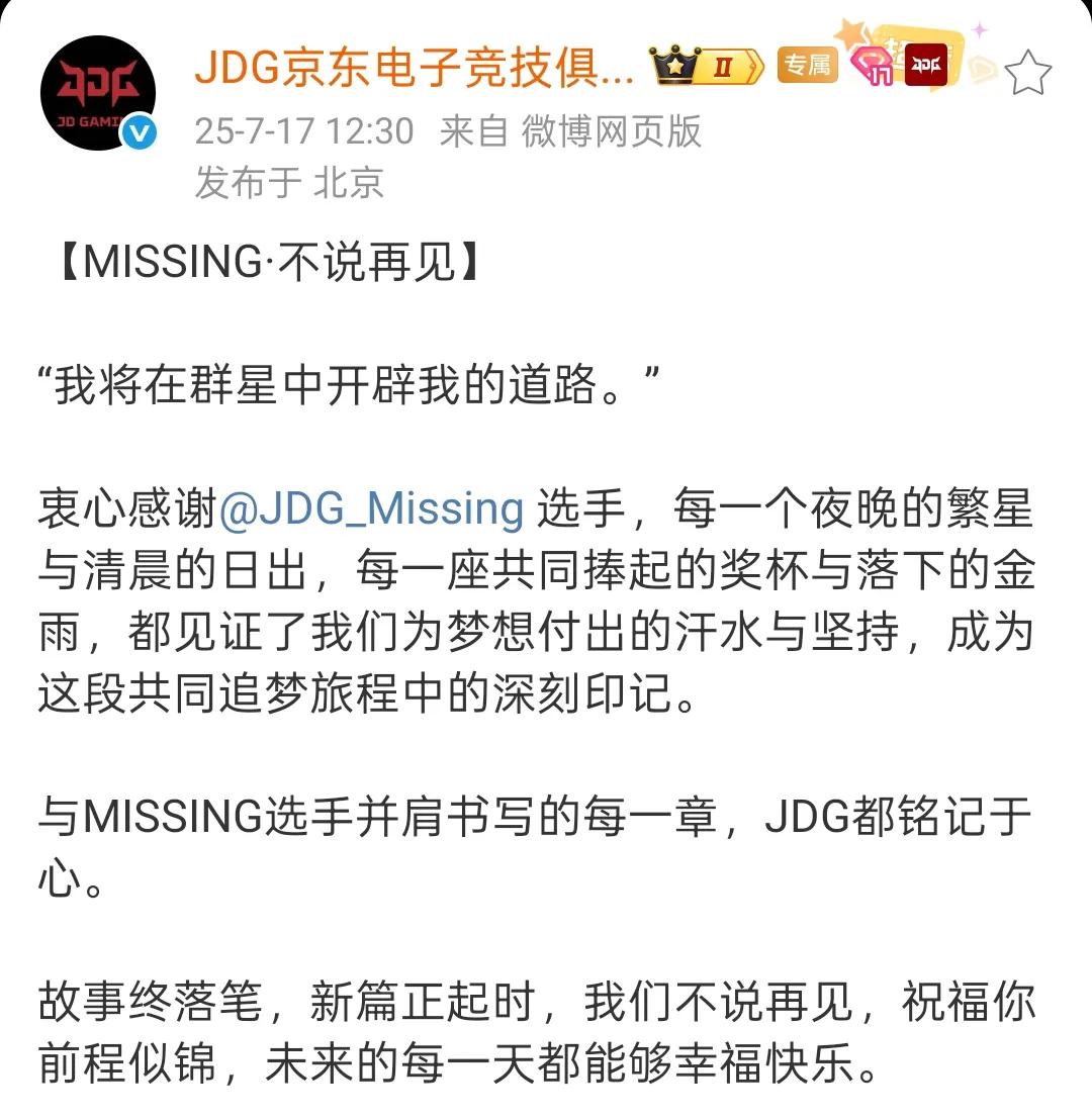 值得一提的是,随着Ale和Missing的离队,2023年MSI季中赛冠军JDG的夺冠阵容已全部解散。这支曾经意气风发、不可一世的战队,如今已物是人非。2023年的JDG拥有顶尖的人员配置,全年几乎包揽了所有英雄联盟赛事冠军,却最终遗憾地输给了大魔王Faker,倒在了全球总决赛的舞台。如果当年JDG能够打赢那场半决赛,或许LPL的格局将因此改写。