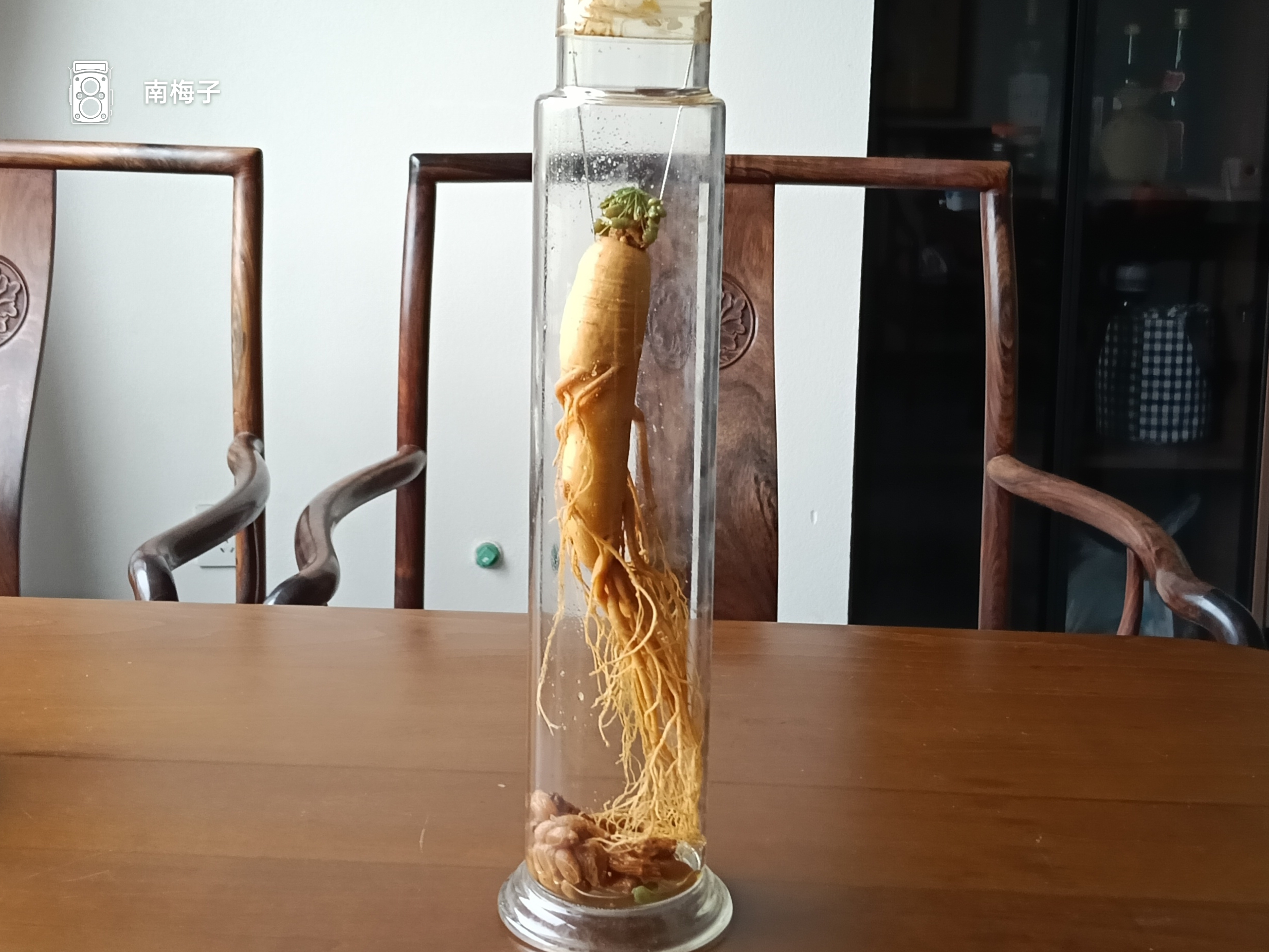 朋友十年前送给先生的那瓶人参酒,在橱柜的角落静静躺了整整十个春秋。白色透明的玻璃瓶身上,“长白山野山参”的烫金标签早已在岁月中褪色,感觉到瓶子里的人参可能吸取了酒气,开了一些花。在我的印象中,这棵人参,比十年前变大了许多。今年的3月8日傍晚,先生从厨房探出头来笑着说:“那瓶老参酒,今天该开封了。”于是这瓶承载着十年情谊的佳酿,终于在这个特别的日子里见了底。