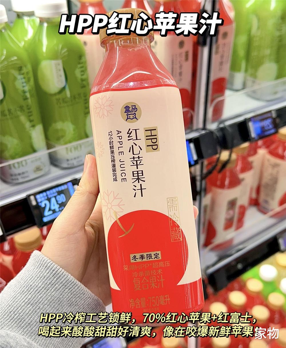堪称盒马的“冬季限定”苹果汁,和许多调味型、香精味很重的苹果汁饮料不同,它采用HPP冷榨工艺,添加了70%的鲜榨红心苹果和富士苹果果汁,不夸张地说,每一口都像是在吃下无渣的苹果。