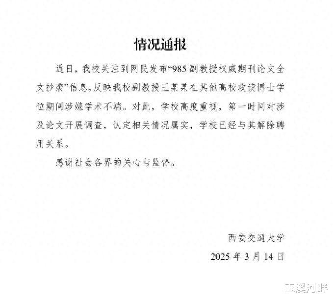 西安交通大学近日发布了一则关于解除与副教授王某某聘用关系的通告,原因是其博士期间发表的论文存在严重的抄袭行为。事情的起因是有人实名举报,学校迅速成立调查组展开调查,最终确认举报属实。这个处理结果可谓是“挥泪斩马谡”,彰显了学校维护学术诚信的决心。整个事件从举报到处理,时间线清晰,处理果断,得到了不少人的赞许。
