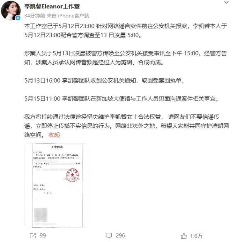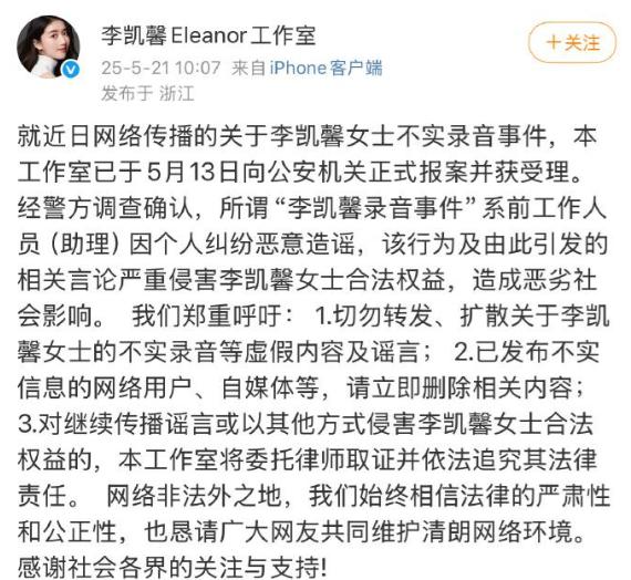 5月13号大半夜三点,北京朝阳那旮旯的警察叔叔把李凯馨的前助理叫去喝茶了。这姑娘肯定没想到,她剪的那段录音能惹得警察叔叔出动。下午四点,鉴定报告就出来了,确认那录音是拼凑的。