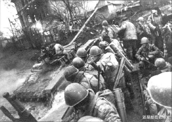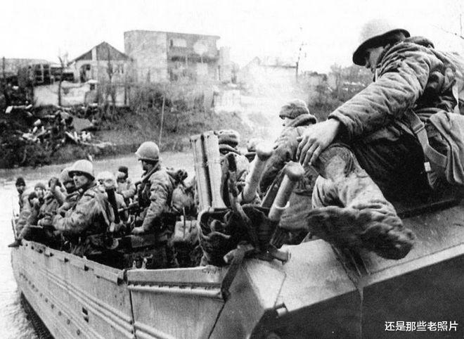 1995年2月3日,俄罗斯格罗兹尼郊外的孙扎河表面凝结着薄冰。气温降至零下 ,俄军第879独立空降突击旅的士兵们正在乘坐坦克装甲运兵车,以渡过孙扎河。