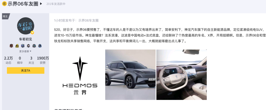 520,好日子,示界06要预售了,不懂这车的人是不是以为又有啥界出来了,简单安利下,神龙汽车旗下的自主新能源品牌,定位紧凑级纯电SUV,进攻10-15万级市场。神龙最懂啥?法系浪漫,这波是中国电动+法式底盘,还给联袂了个热度最高的车名,X界,开局挺顺啊。但是,示界06会和雪铁龙和标致共享销售网络,平衡开支,这共享和平衡俩词儿一出,大概就能琢磨出点儿事了。