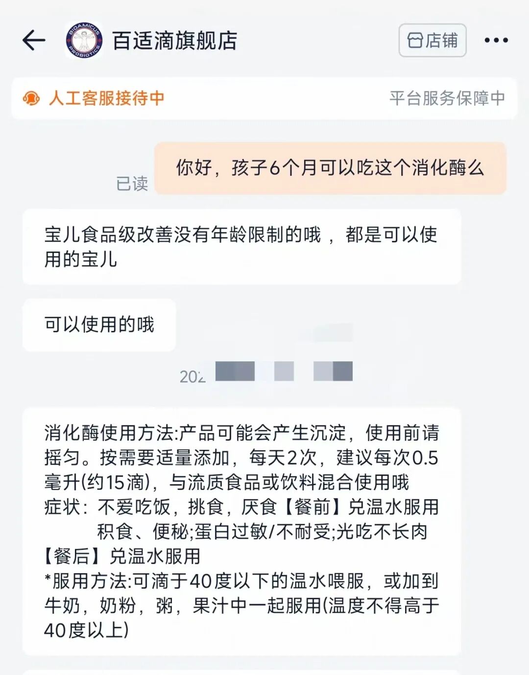 百适滴旗舰店客服称其消化酶食用无年龄限制。 电商截图