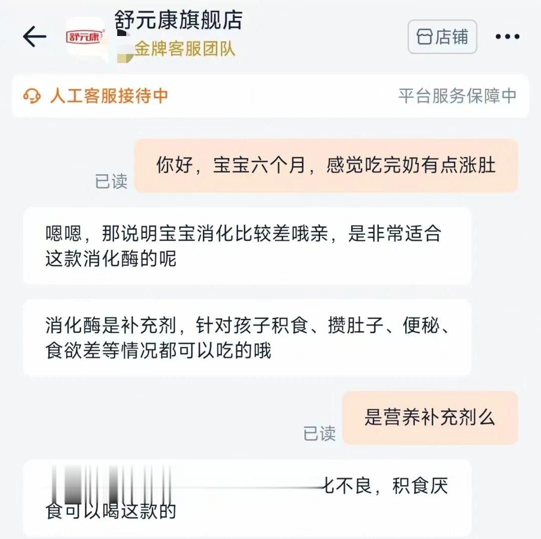 舒元康旗舰店销售的一款“舒元康消化酶滴剂”,同样在商品页面打出“宝宝专用消化酶”。针对“宝宝6个月,吃完奶肚胀”的描述,该店客服称,“那说明宝宝消化比较差,是非常适合这款消化酶的。消化酶是补充剂,针对孩子积食、攒肚子、便秘、食欲差等情况都可以吃”。