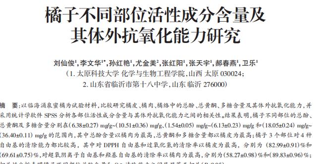 [1]刘仙俊,李文华,孙红艳,等.橘子不同部位活性成分含量及其体外抗氧化能力研究[J].食品研究与开发,2021