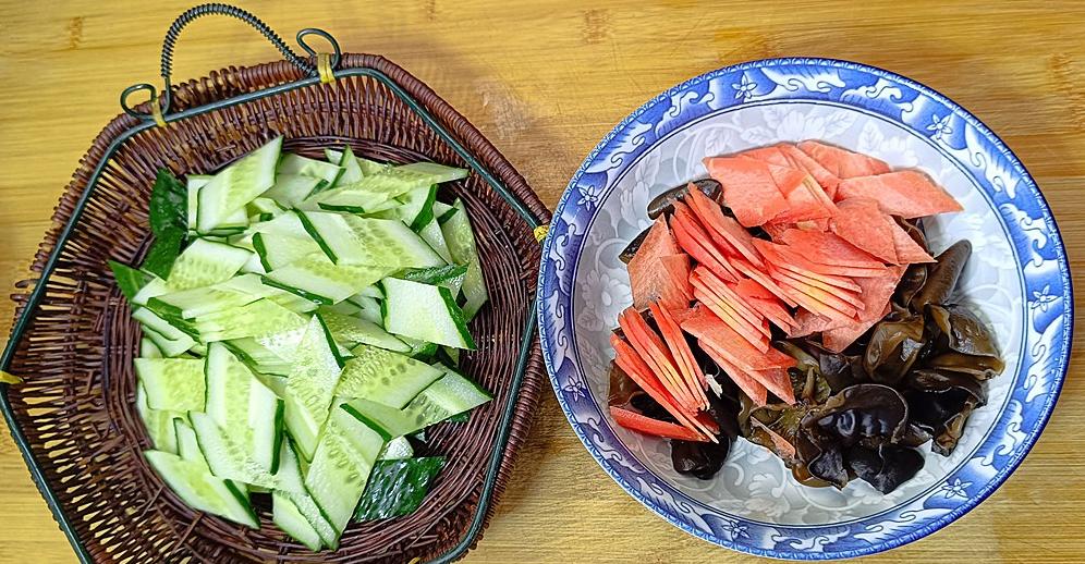 黄瓜切片,鸡蛋打匀,准备一些木耳和小米辣就够了。