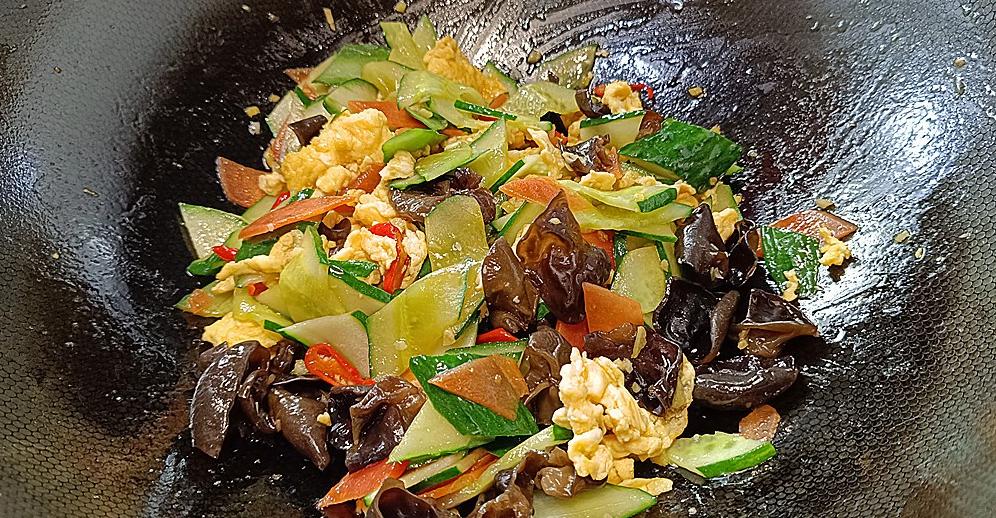 然后加入黄瓜、木耳和胡萝卜,开大火快速翻炒。