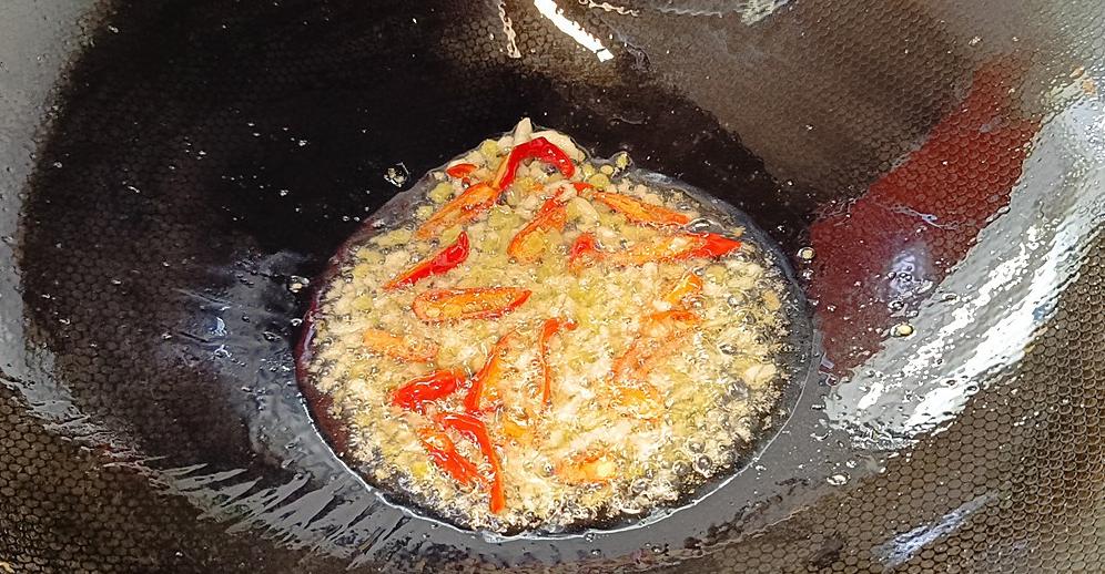 重新起锅放油,放入姜蒜和小米辣,炒出香味。