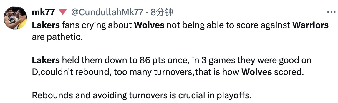 “湖人队球迷在哭诉森林狼队无法在对阵勇士队的比赛中得分,但是湖人队也曾将森林狼队的得分限制在86分以下。不过湖人队自己的篮板球抢的太少,失误却太多,这都是让森林狼队得分的方式。在季后赛中,篮板球和避免失误才是至关重要的。”
