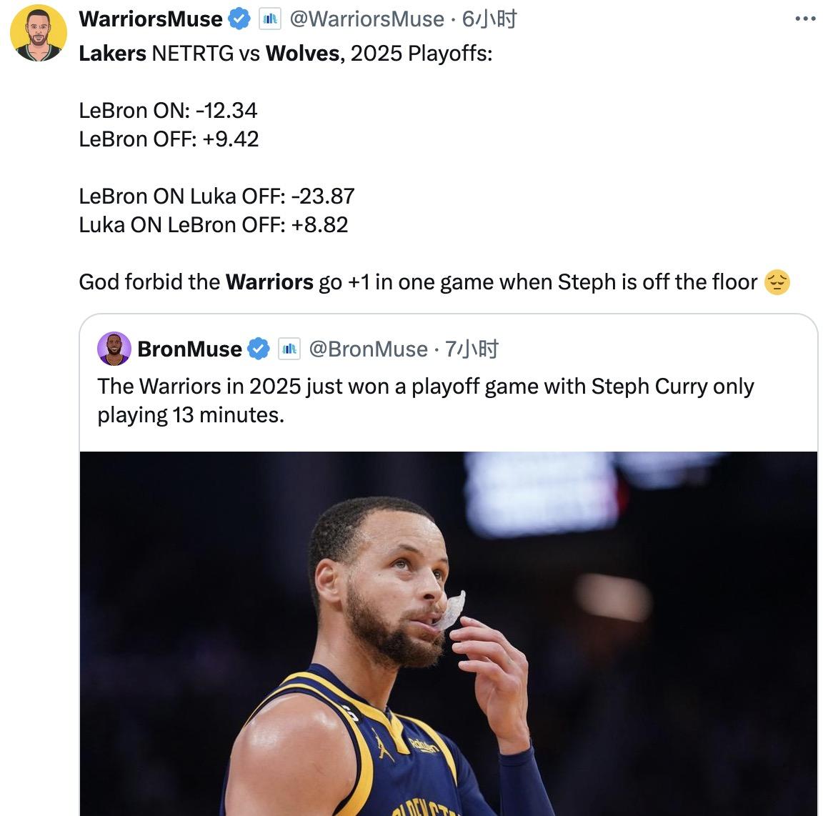 有趣的是,一位湖人博主发推揶揄:“库里仅打了13分钟,但是勇士队依旧赢下了一场季后赛比赛。”但是他却遭到了一位勇士博主的正面打脸,这位勇士博主晒出湖人队和森林狼队系列赛的效率值:“詹姆斯在场-12.34,詹姆斯不在场+9.42;詹姆斯在东契奇不在-23.87,詹姆斯不在东契奇在+8.82。”