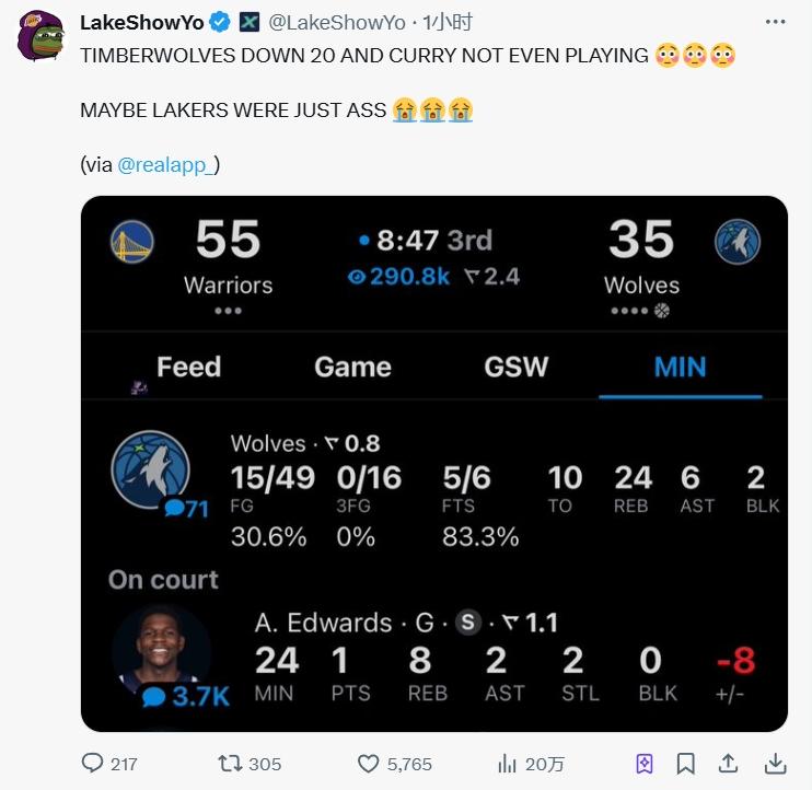 著名湖人媒体LakeShowYo则发推感慨:“森林狼队落后没有库里的勇士队达到20分,可能就是因为湖人队太垃圾了。”