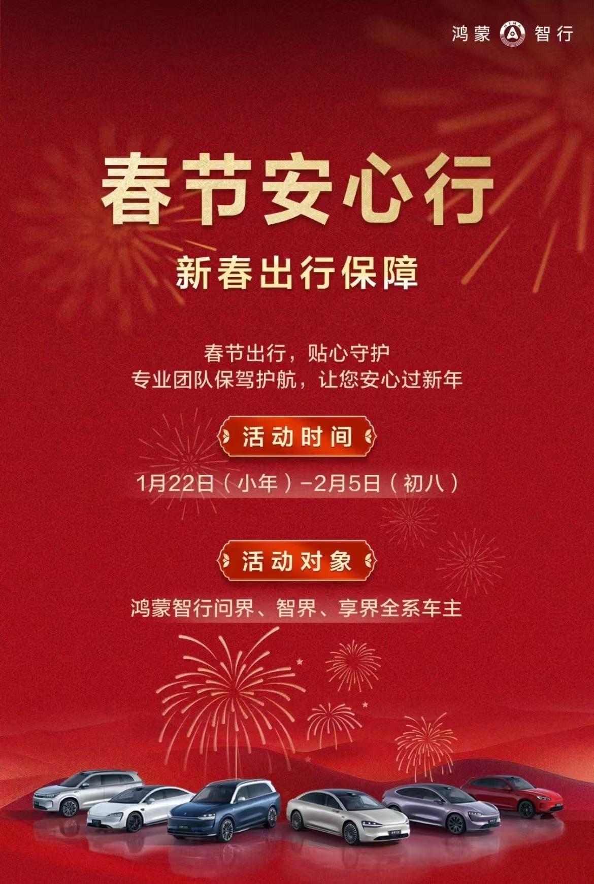 为了让用户在春节期间的出行更加顺畅、安心,鸿蒙智行推出了“春节安心行”全方位服务保障。此次活动从1月22日(小年)持续至2月5日(初八),涵盖鸿蒙智行问界、智界、享界全系车主。