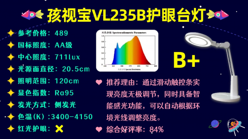 哪一款护眼台灯好用又便宜?孩视宝VL235B护眼台灯外观挺朴实的,灯体用了航空铝材和ABS树脂搭配,不过部分塑料材质摸起来质感一般,没什么高级感。它的灯头是20.5cm的圆形设计,面光源加环光源的组合,光线均匀度符合国AA级标准,日常看书写字够亮也够均匀。功能上还挺实用的,有3900K、3650K、3400K、4150K四档色温可以选,亮度能通过滑动触控条无极调节,还有智能感光功能,能自动跟着环境光调整亮度,不用手动来回调。但缺点也明显,部分转轴阻尼感太强,调整角度时有点费劲,显得生硬。