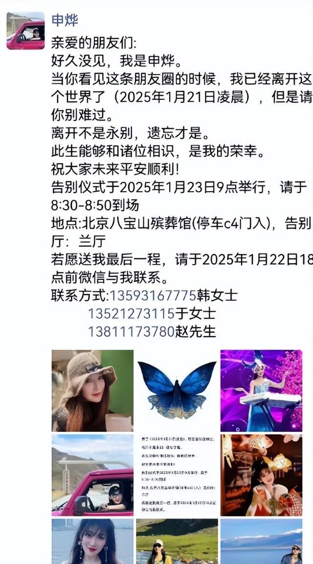 值得一提的是,申烨的讣告是自己提前写好发在了朋友圈。2025年1月23日9点,申烨的告别仪式在北京八宝山殡葬馆按时举行,很多人都去了现场悼念。
