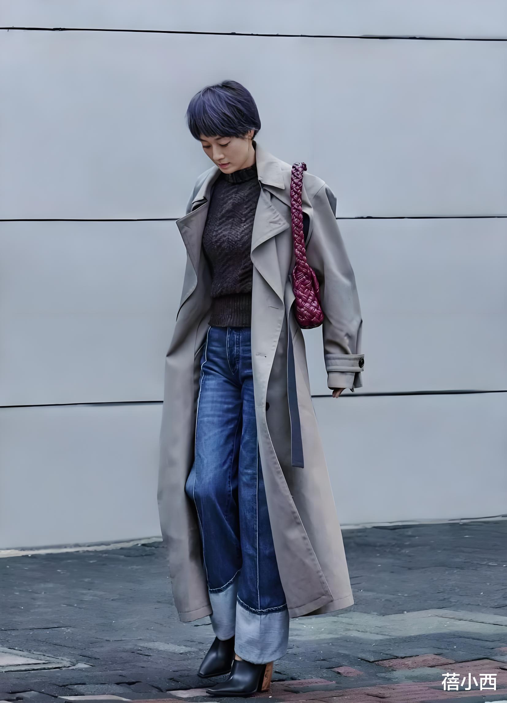 内搭除了颜色这一亮点外,版型和衣长都很受欢迎。毕竟宽松型衣服上身后遮肉,短款版型可优化身材比例,哪怕是五五分也能在视觉上呈现四六分身材。牛仔裤在时尚界屹立不倒,这条裤子在裤脚处融入了宽边设计,一深一浅极具层次感。裤腿松量多多,所以上腿后给人的第一印象是“休闲不单调”。手上拎了一款酒红色包包,为整体穿搭增添了一份亮色。
