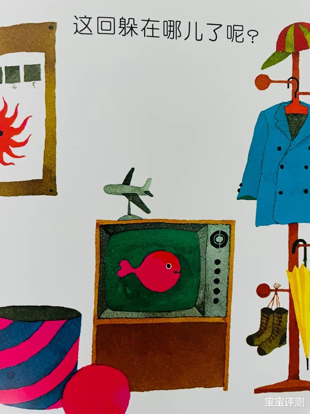 啊,我找到了,它藏到电视里!不仔细看,还以为是电视里播放的一条鱼!真是个伪装大师!