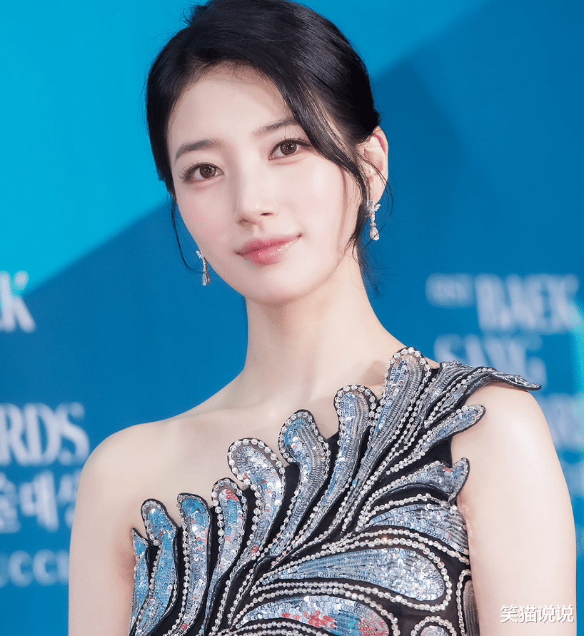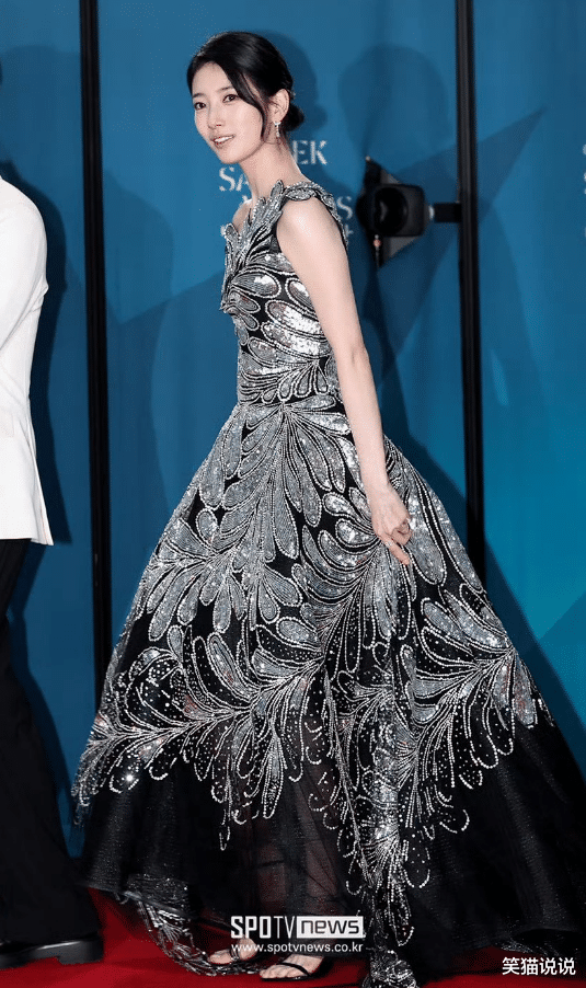 裴秀智穿着单肩羽毛串珠亮片公主裙亮相,黑色打底的公主裙点缀着银色窜珠亮片羽毛的造型,看起来十分华贵,搭配她那挽起的发型,显得雍容华贵。