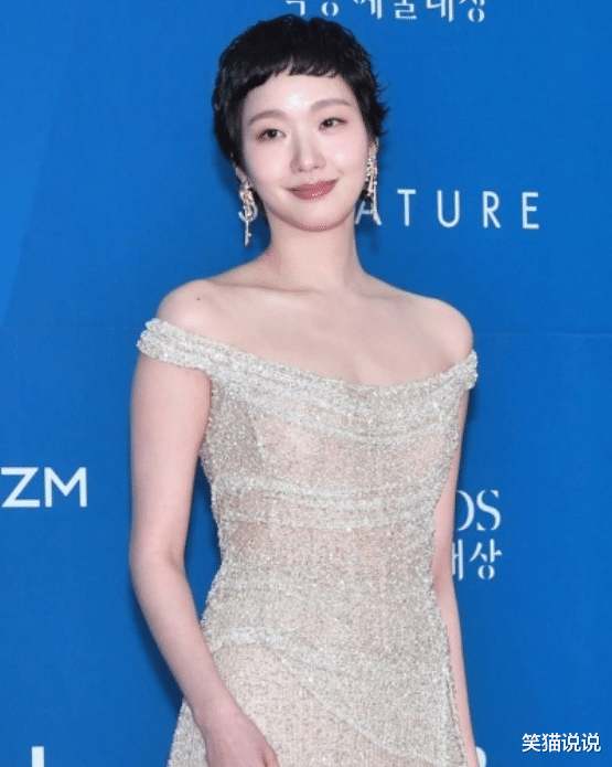 金高银穿着低胸的一字肩碎钻连衣裙亮相红毯,她戴着金属耳环,搭配烫卷的短发造型,看起来有些慵懒,又有些浪漫气质。