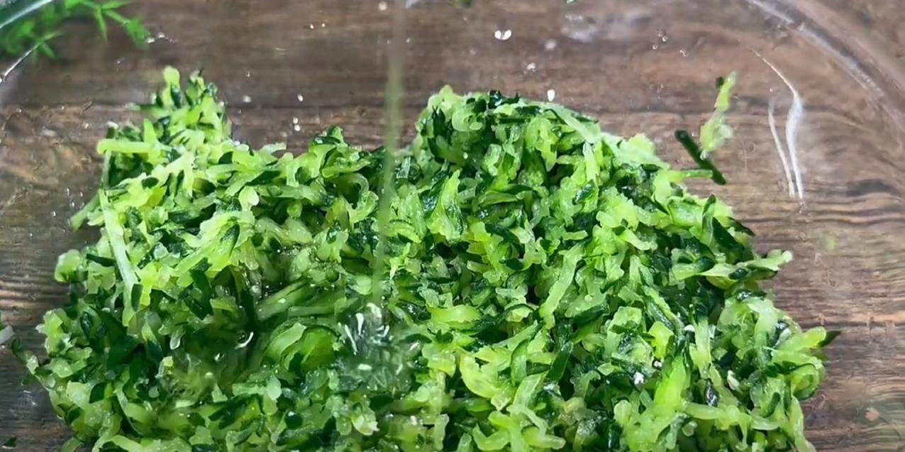 将黄瓜汁留着和面,黄瓜丝挤干水分备用。