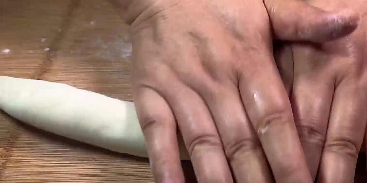 然后将面团分成几份,搓成长条,切分成大小均等的面剂子,用擀面杖擀成圆形面片。