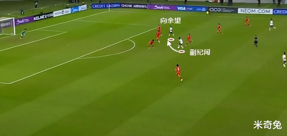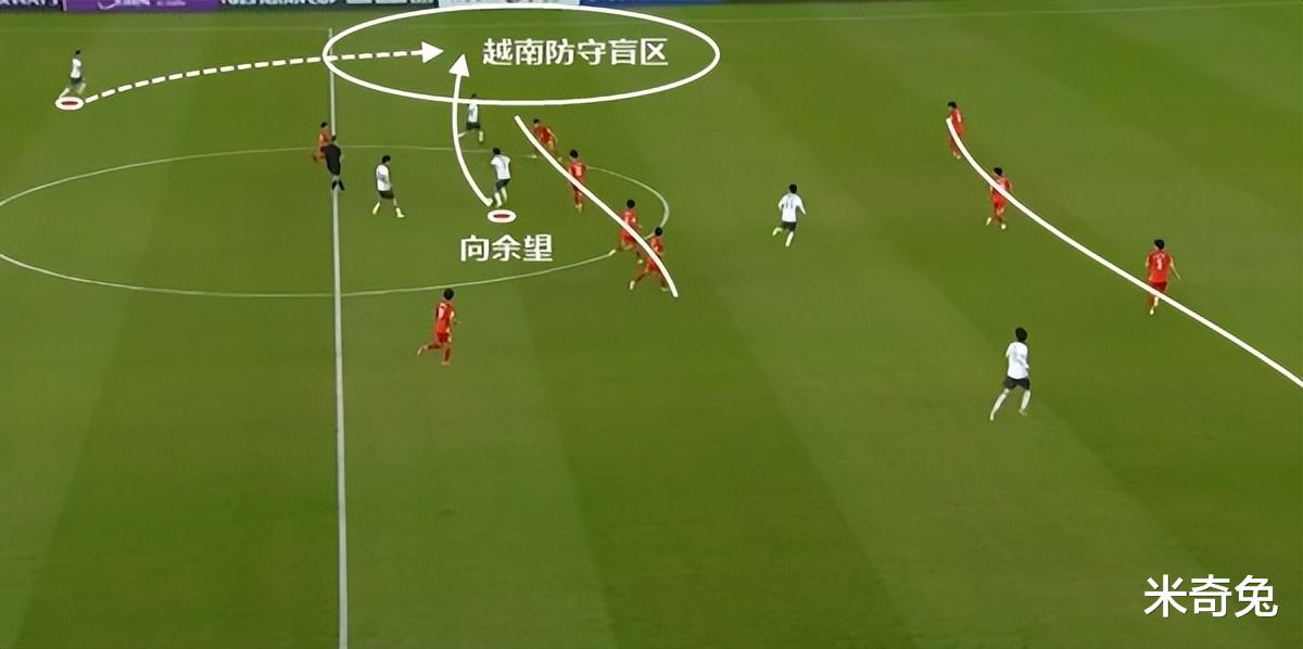 蒯纪闻和向余望都有较大的活动范围,于是就能找到机会回撤拿球,随后分球给到越南队防守盲区的右边路(也就是U23国足的左边路)。