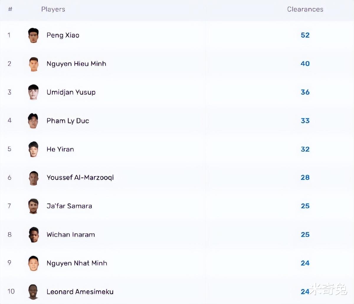 从榜单上可以看到,踢了5场的彭啸贡献了52次解围,领先第二名12次,比队友吾米提江多出了16次。