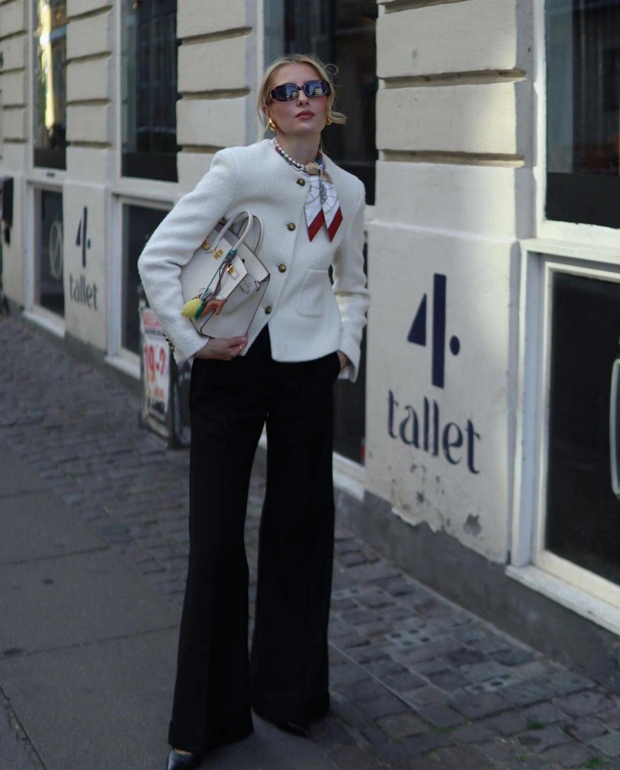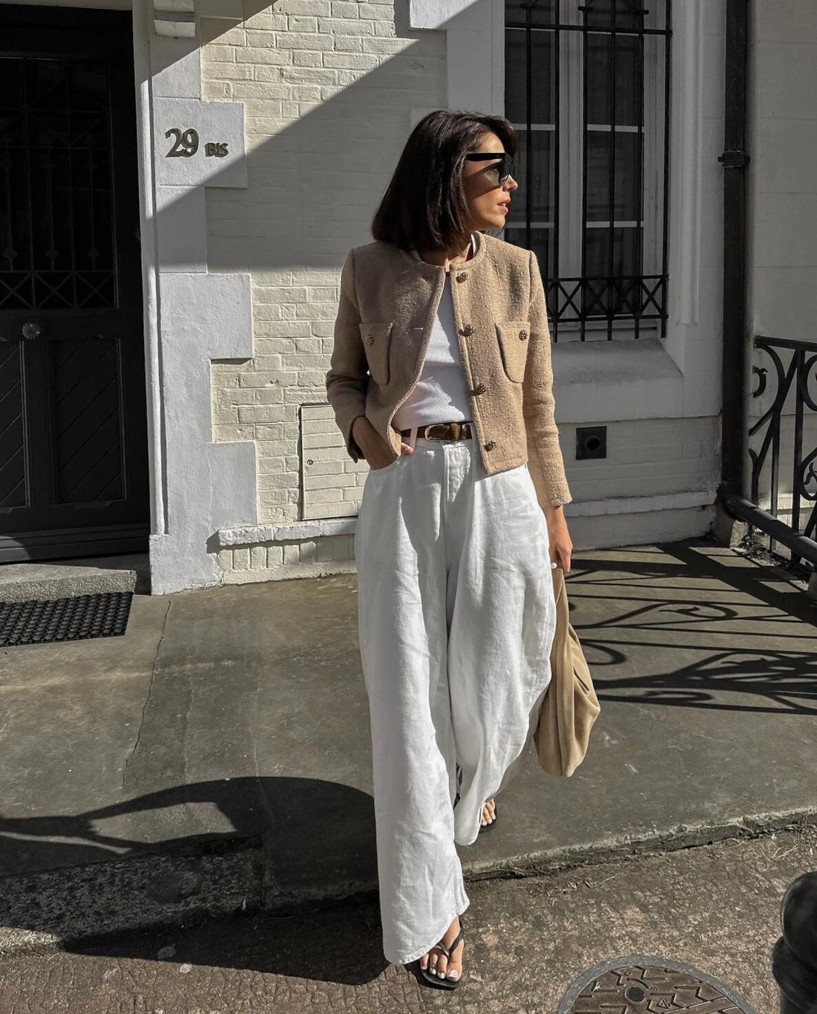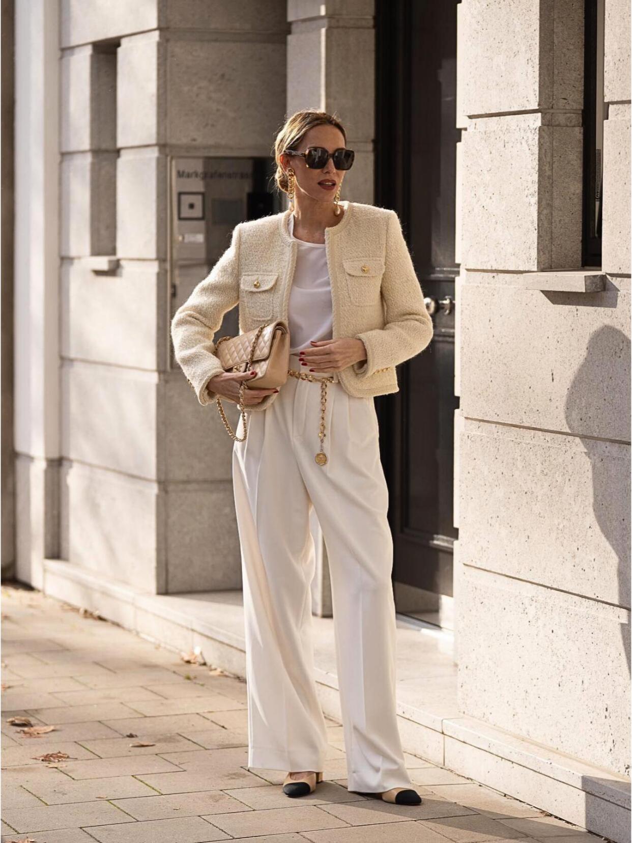 日常出街时,小香风外套也能轻松驾驭。搭配休闲阔腿裤或牛仔裤,既舒适又时髦。内搭一件圆领T恤,脚踩小白鞋或乐福鞋,既休闲又不失精致感,适合各种日常场合。