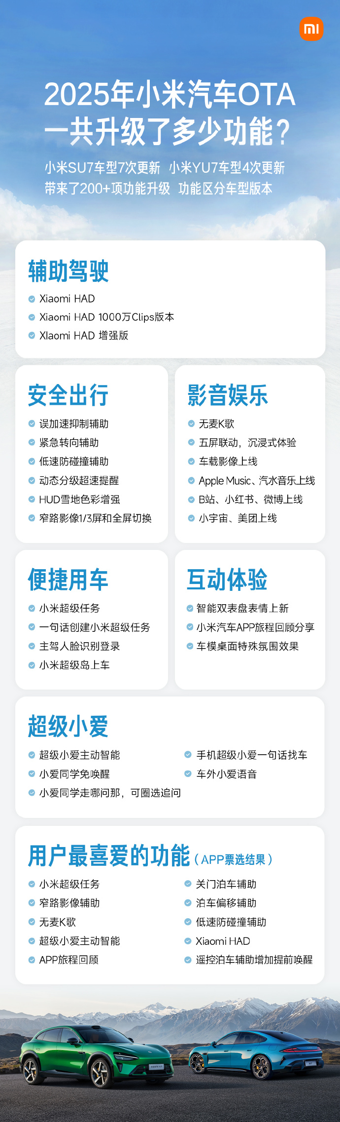 小米汽车通过以用户需求为核心、技术为支撑、安全为底线的综合策略,有效平衡了OTA更新频率与功能稳定性。2025年,小米SU7车型完成7次OTA更新,YU7车型完成4次更新,累计带来超过200项功能升级,在保持高频迭代的同时,确保了新功能的可靠性和用户体验。