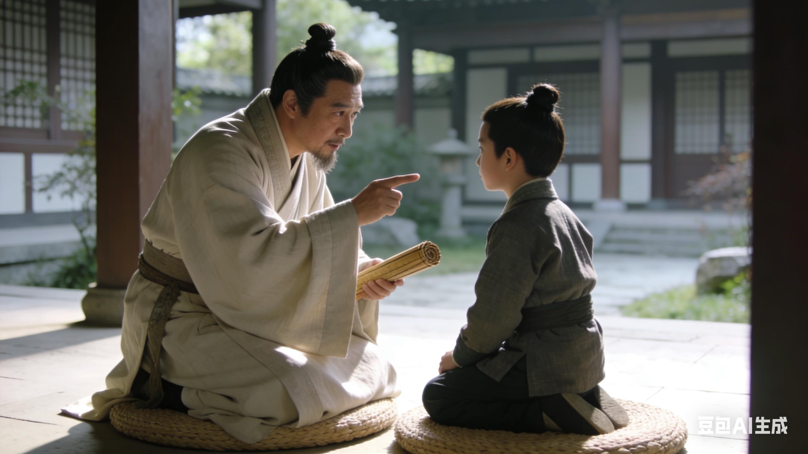 他对子思的教导,既传孔子的仁礼之道,也教自己的修身、孝道之学,言行身教,一丝不苟。子思年少聪慧,在曾子的教导下,继承并发展了儒家思想,后著《中庸》,成为述圣,开创了思孟学派。曾子的动作里,满是师者的严谨:讲学时正襟危坐,与子思论道时避席而立,言辞恳切,循循善诱;他的心理始终清醒:自己不是要做扬名天下的学者,而是要做孔门道统的守夜人。