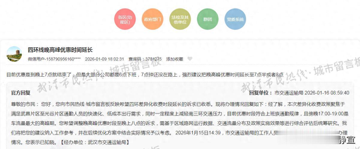 官方回复:经了解,本次差异化收费政策聚焦于满足武昌片区至光谷片区通勤人员的快速化、低成本出行需求,同时一定程度上减轻南三环交通压力,目前优惠时段符合上班族通勤规律,且傍晚17:00-19:00是车流量最大的高峰期。您希望调整晚高峰优惠时段至晚上八点的诉求,需基于区域路网运行数据、交通流量分布及政策实施效果等进行综合评估后统筹研究。我们将把您的建议纳入工作参考,并在后续优化方案中结合实际情况予以考虑。