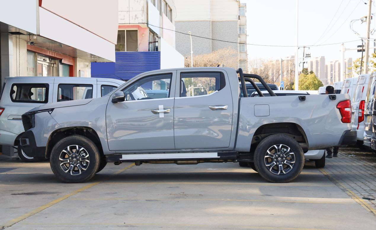 车身侧面,平直的车顶线条保证了车内空间的宽敞,而经典的双排皮卡造型,则在实用性与美观性之间找到了完美的平衡点。分段式腰线和轮眉、侧裙部分的隆起筋线,让车身侧面更具层次感和力量感。简洁的五辐式轮毂,与整体硬派风格相得益彰,没有丝毫的拖泥带水。