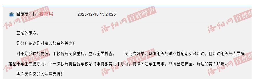 学校是不是一定要组织研学活动呢?实际上,在此之前曾有洛阳市民在当地电视台的问政节目中提问,当时洛阳市教育局的回应是:国家倡导学校组织学生研学,但是要基于学生自愿、确保学生安全、有一定的研学主题、对学生的成长有帮助等原则,学校可以开展研学活动,并不强制要求每个学生、每个学校都参加/组织研学活动。