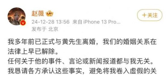 2024年12月28日,赵薇在社交媒体上发布消息,宣布她与黄有龙几年前就已经离婚。