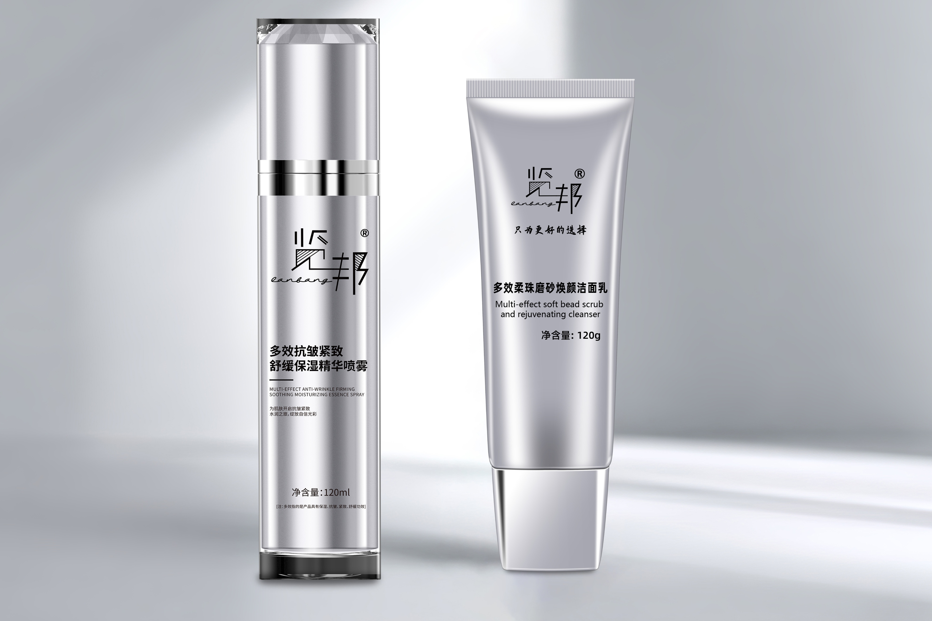 览邦此套装备摒弃了华而不实的过度包装,直击核心:一支120g的多效控油磨砂洁面乳,一瓶120ml的多效抗皱紧致精华水。其设计逻辑清晰高效: