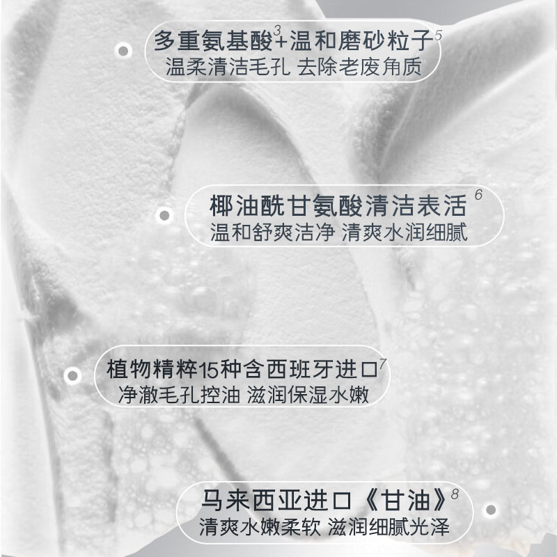 清洁体系:采用椰油酰甘氨酸钠、月桂酰谷氨酸钠等氨基酸表活复配,保证了足够清洁力的同时,pH值接近肌肤天然弱酸性,避免皂基带来的过度清洁与屏障损伤。搭配超细水合硅石柔珠磨砂微粒子,提供极其细腻的物理磨砂感,能有效温和去除老废角质和黑头,无粗糙划伤感。
