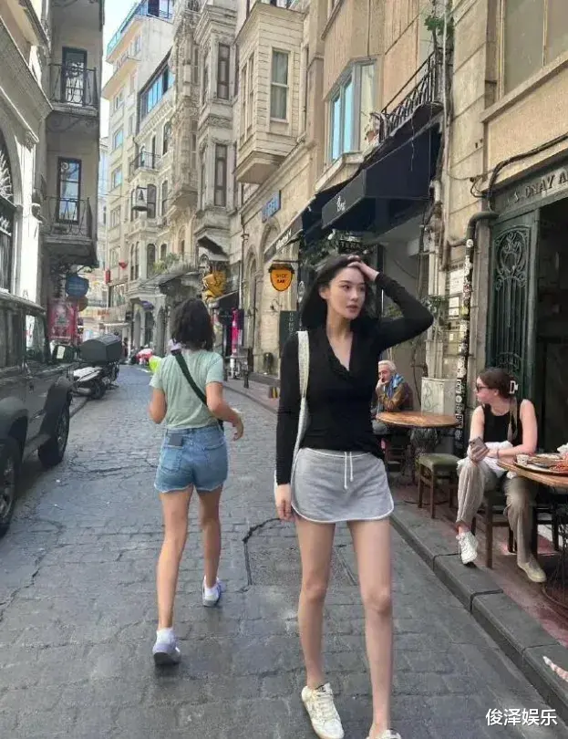 下身配了一条同色系的开叉短裙,大秀美腿,又直又匀称。