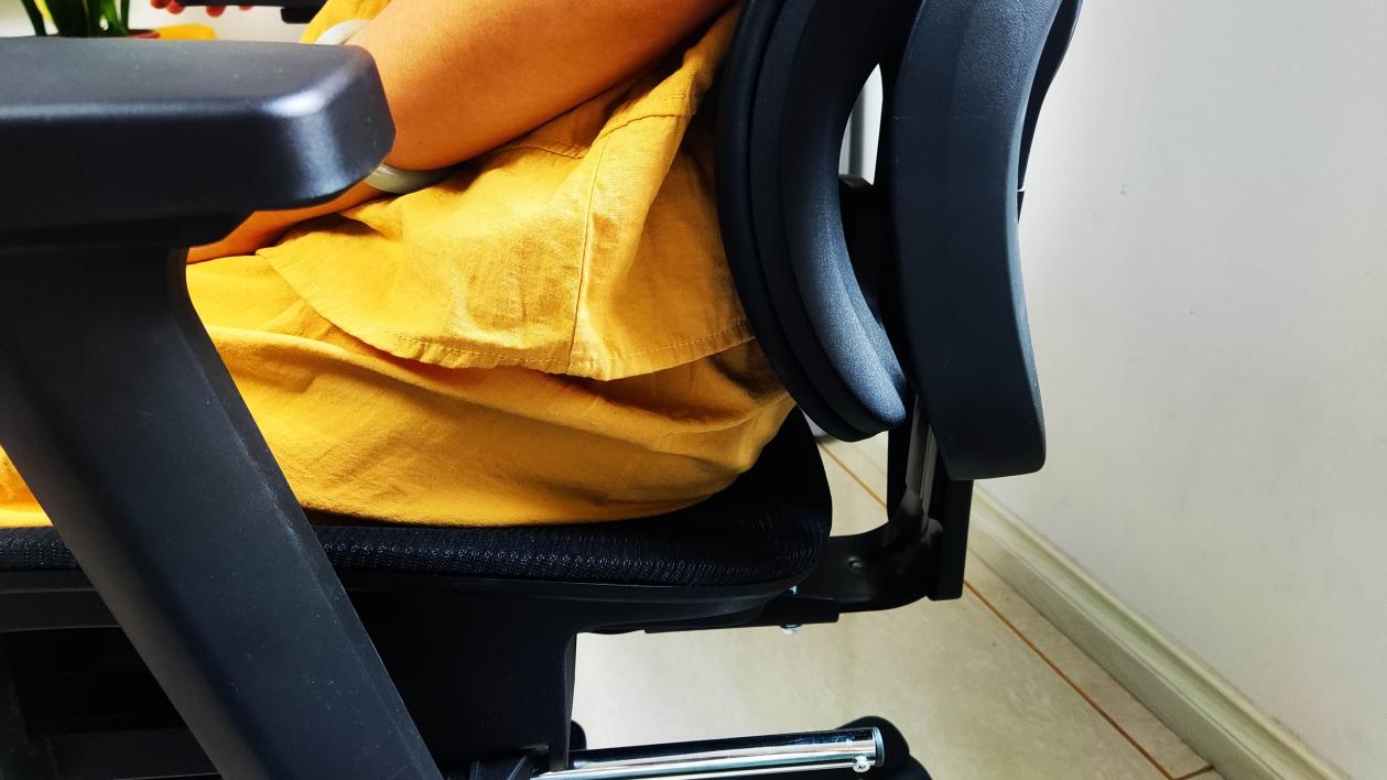 Fit2工学椅最大的亮点是它的灵动腰靠系统。它的腰靠除了可以上下调节,以适应不同人群的使用习惯外,还创新的使用了三区浮翼结构。腰部挤靠后,两翼会向内侧略微弯曲。和普通的固定腰靠相比,Fit2的腰靠和腰部的接触面积更大。