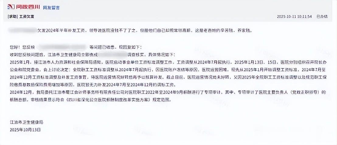 10月,有医务人员通过“问政四川”平台披露, 绵阳下辖的江油市某三级甲等中医医院存在欠发2024年半年补发工资的问题。10月14日已圆满解决。